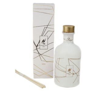 Аромадифузор Hypno Casa Assolute “Pepe” – це приємний аромат елітної серії, створений на основі суміші високоякісних синтетичних та натуральних ароматичних олій італійськими парфумерами. Це рішення для інтер’єрів у різних стилях, для наповнення будинку чи офісу винятковим ароматом. Реалізовано через пофарбований скляний дифузор циліндричної форми з графічним візерунком, прозорим парфумом і занурюваними ротанговими паличками.
